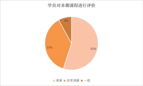 据学员提交的满意度调查表统计,此次参与学习的学员中,37%的学员对课程内容表示“非常满意”,8%的学员表示“一般”,超一半的学员对课程表示“满意”。