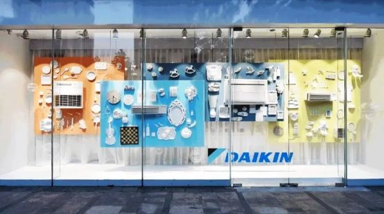 大金空调杭州展厅,运用3D打印技术的橱窗展示,用艺术化的方式向观者展现大金的零部件之美,生动有趣。