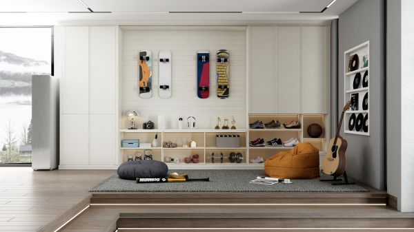 此外,贴心设置的客厅专属衣物护理机,能对日常衣物及运动器材进行消毒,帮助减少细菌侵害。更值得一提的是,这款“诺斯系列-原态百变客厅”蕴含了更多个性化设计巧思,简直是潮人的福音。比如专属的潮鞋展示区、唱片展示区、鸭舌帽展示区、涂鸦滑板展示区。在“诺斯系列-原态百变客厅”,每个个体的个性都能得到最充分的展示。