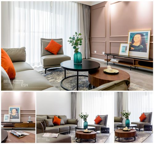 客厅作为重要的一部分,与阳台相接。软装设计师选择的是更具有透光性的亚麻窗帘,没有多余的杂色,这样能保证客厅光线的充分照射。包围式的客厅格局正对电视背景墙,方便邀好友相聚放松,双层边几稳定空间层次感。背景色选择茱萸粉,雅致不流俗,再在墙面上做石膏线造型,提升精致度。小编觉得这样的设计简单又温馨。