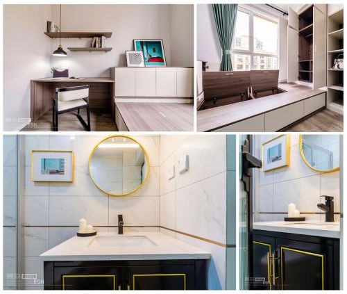 书房的书桌与定制柜体相连,榻榻米下方皆可储物,收纳能力强大,利于培养收纳,整体看起来颜色统一,实用又美观;卫生间以白色为主调,金色线条增添轻奢感,一体盆搭配白色墙砖更加清爽干净,让日常生活也多了情趣。