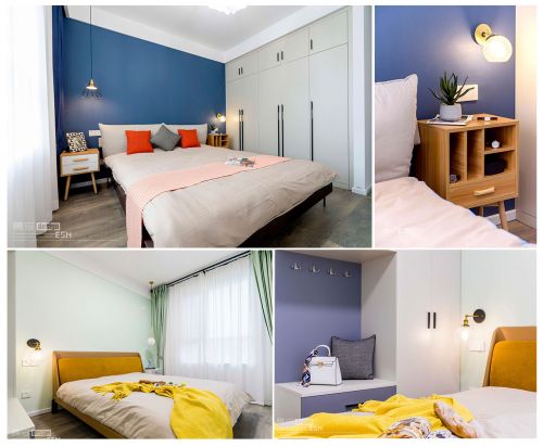 比起传统的白墙卧室,这间主卧是“大胆”的,主卧选用经典蓝做床头背景点亮空间,打破了传统黑白色调的沉闷感,另外选择不同造型的吊灯和壁灯实现不对称的美感。次卧选择豆绿色作为主调,窗帘选择与背景墙同色加强视觉效果。