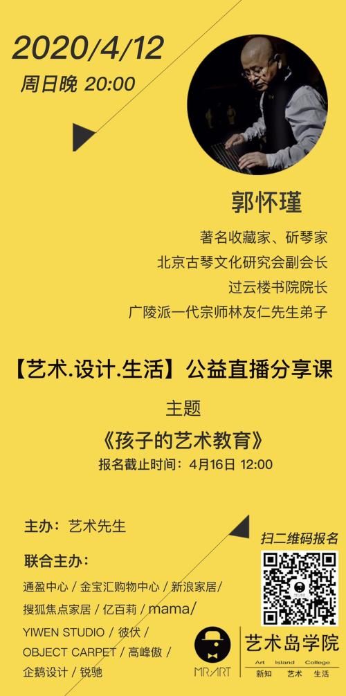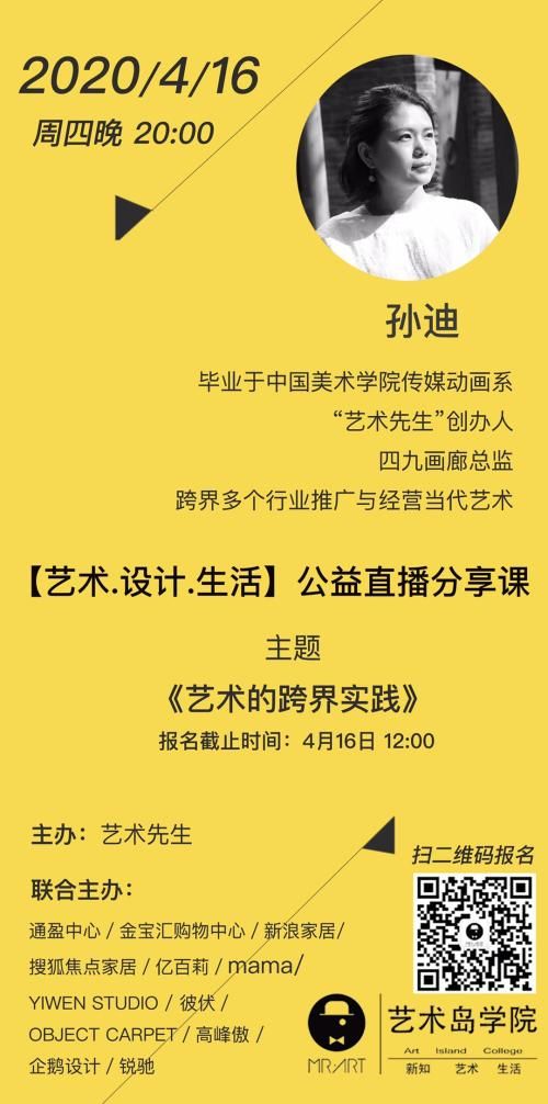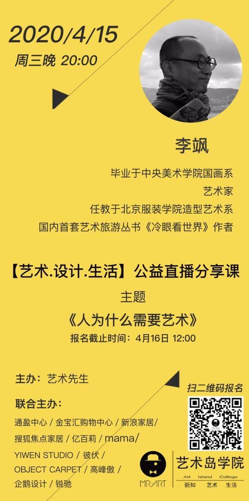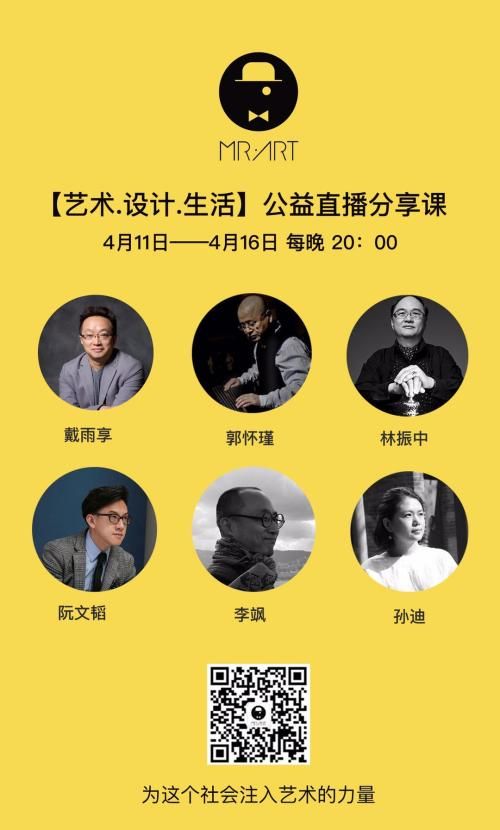 之所以策划“艺术.设计.生活”公益直播分享活动,是希望能引导大家从不同的角度去了解艺术,了解设计,感悟生活,让我们的生命得到更好的滋养。同时这也是“艺术先生”对世界无界观念的又一次社会实践,“艺术的无界,思想的无界,空间的无界,身份的无界,行业的无界”,我们需要突破界限,获得精神的自由与创造力。
