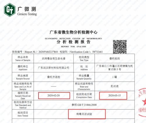 2020.3.15这个特别的日子,广东润立又收到了来自广东微生物研究所送来的又一份检验报告。每一份检验,如每一份的答卷,是对广东润立多年来科研工作,产品品质的肯定。