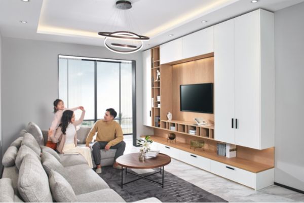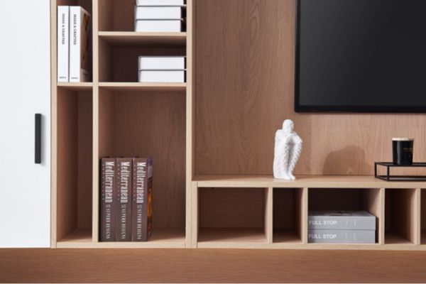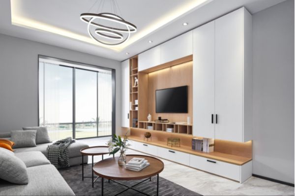 在电视背景墙的设置上,多层次融合落地抽屉、零食柜、L型开放架、吊柜等丰富的储物空间。L型开放架,使用的是12mm厚的板子,轻盈不笨重。满墙的柜体,能收纳更多的杂物,适合爱囤货的你;打开柜子,看到满满的物品,尤其是零食,让人有满满的幸福感。