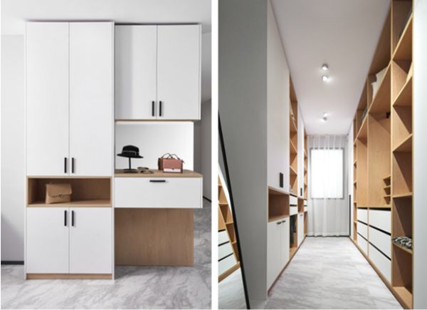从玄关高低错落的空间列阵,到餐边柜储物格的错落放置,从客厅设置的满墙柜体,容纳主人丰富的私藏,到衣帽间半开放设计,可盐可甜,收放自如,张弛有度。柏厨将每一个细节做到极致,用每一处设计书写平凡生活里不平凡的诗意。