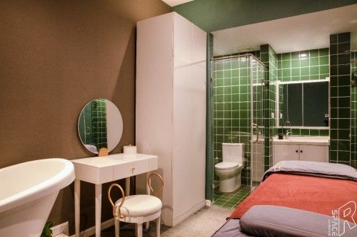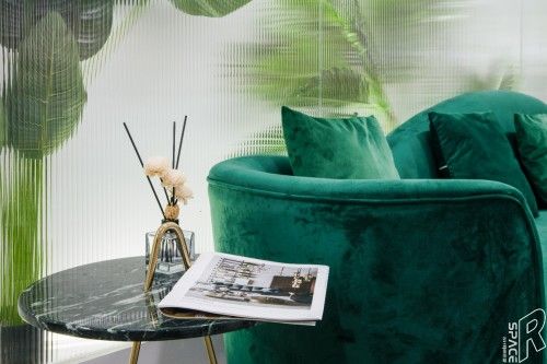 所以我们把原来的墙面pvc大理石花纹饰面板拆掉,采用了墨绿色蚕丝墙布去作为饰面,蚕丝墙布会在灯光下透露出丝丝金线般的纹理,使得大面积看起来不会显得单调却又不抢主次关系,最后我们还觉得缺了些什么,然后我们加了一个红色的雪尼尔材质落地大窗帘,于是,就这样无数人前来打卡的“网红”点出现了,这是我们惊喜的,也是我们觉得设计最该体现价值的意义。