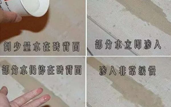 同样的一块瓷砖,用手掂量重量大的是好砖,说明密度大,吸水率低。反之,重量轻的那块是劣质砖。把一杯水倒在瓷砖背面,扩散迅速的,说明吸水率高,在厨卫间使用就不太适合,因为厨房和卫生间常处于水环境中,必须用吸水率低的产品才行。