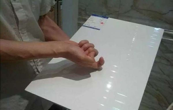 从侧面看瓷砖的组成颗粒是否细腻均匀,内部均匀的瓷砖平直度较高,不会有“翘边”现象。