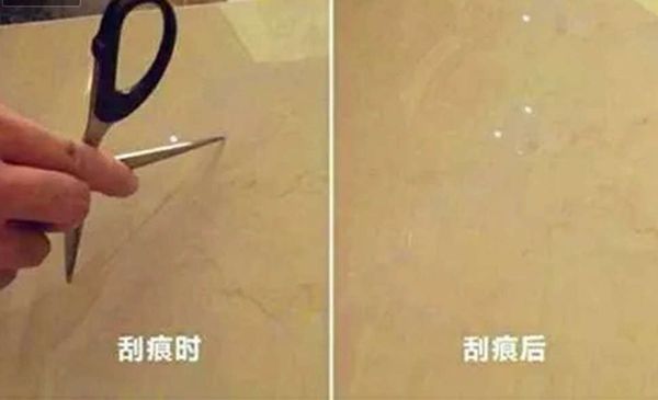 用钥匙或者小刀直接在瓷砖的表面用力划一下,能划出痕迹的是劣质。耐磨性能好的瓷砖,用刀划过是没有痕迹的。