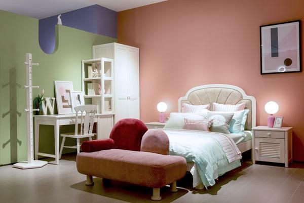 清新淡雅的配色保留了公主房的主基调,撞色墙面搭配着水洗白的学习书桌和衣柜,为公主房添加几分优雅,简单的挂画和小台灯,整体看起来舒适而又清爽。