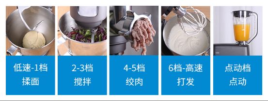 厨师机的档位调速,是根据食材自身的硬度属性决定的。不同的食材,应选择不同的速率来进行搅拌研磨。Beko倍科厨师机一共有8档,以及一个P点动档。揉面、搅拌、绞肉、打发都不在话下。