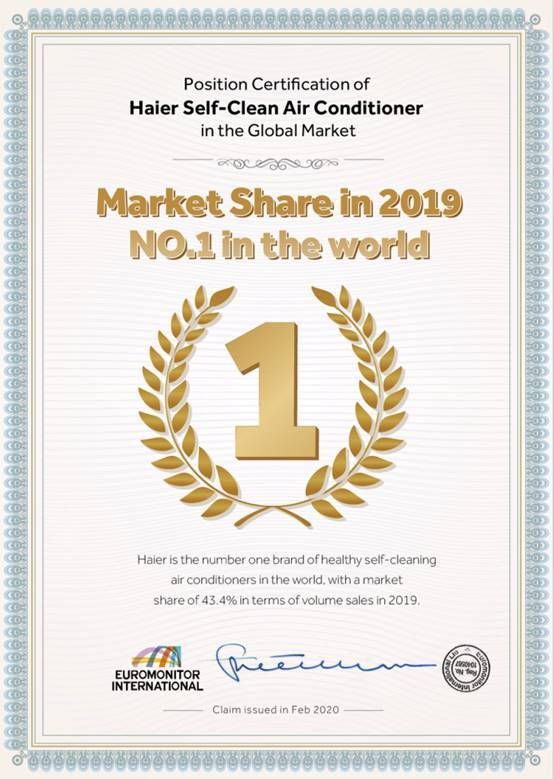 按2019年度销售台数计,海尔空调是位列全球第一的自清洁空调品牌,其所占市场份额为43.4%,并已连续2年位居销量排行榜第一。在全球范围内,海尔自清洁技术已获得意大利、西班牙、俄罗斯等海外15个国家和地区的专利授权。