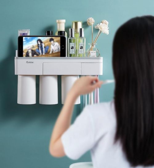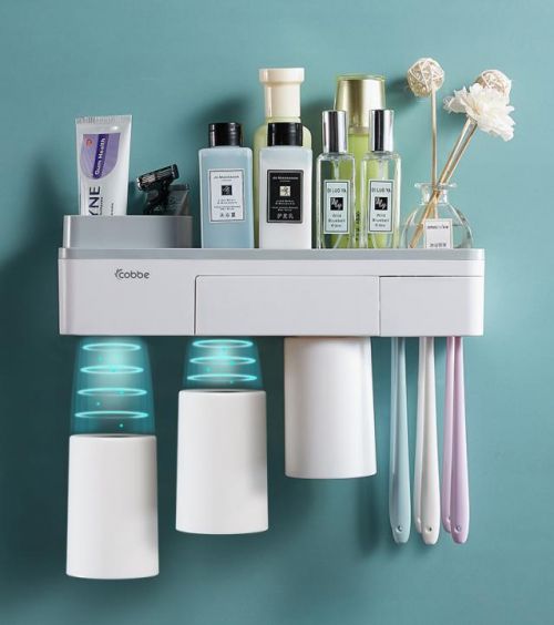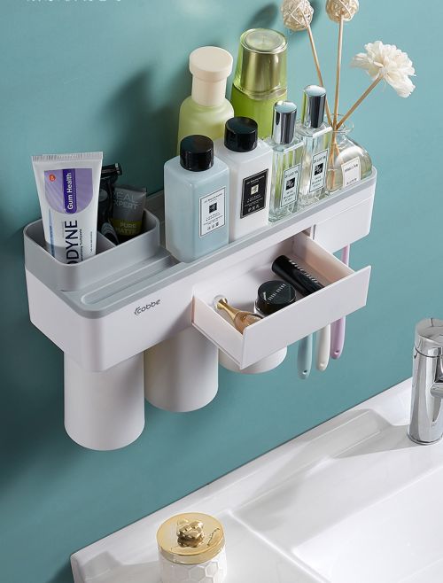 除开专门的牙杯牙刷收纳,这个置物架本身的收纳空间也是非常丰富的。像洗面奶,香水,各种化妆品能直接摆在置物台面上。一些小物比如耳环、口红之类的可以放在中间的小格子里,不易丢失。