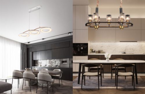 餐吊灯的外形与装修风格和客厅主灯一致为宜,欧式风格适合铁艺餐吊灯,精致浪漫;都市现代风格选择简约有设计感的吊灯,可以打造轻奢风餐厅;有自然元素和色彩的餐吊灯更适合美式、田园风格,衬托自然清新感;带木元素的吊灯适合日式或中式风格餐厅……以颜值选择餐吊灯没有错,能让餐厅更有整体感,在漂亮的餐厅中吃饭,往往使我们就餐心情愉悦。