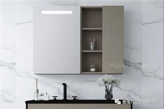 汉普顿系列镜柜设计颇具特色,左右开门,中间是开放格。