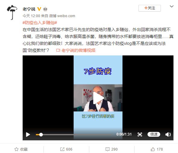 4月7日,微博大V老宁说分享的一支外国人在中国的防疫视频在网上引起了不小的轰动。据悉,这是居住在中国的法国艺术家巴斗先生拍摄的,视频中巴斗先生分享了他使用海尔智慧家电7步搞定消毒杀菌工作的经验。该视频在一周内已经被转发到了抖音、小红书、微博、秒拍等多个平台,不仅获得众多网友点赞还引得网友纷纷效仿。