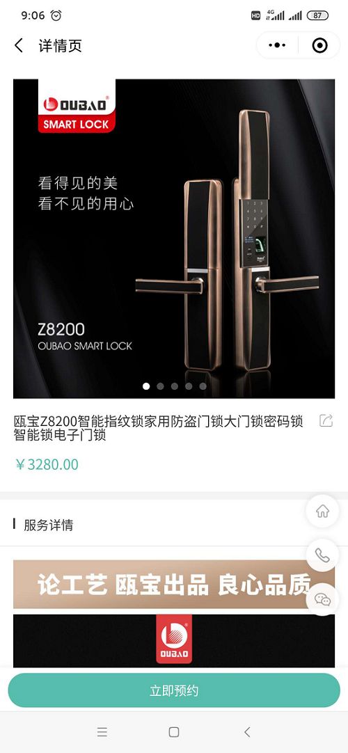 另外,瓯宝客服集成了产品的在线预约安装功能,用户的产品需求可以直接在该系统上完成预约安装。用户在浏览瓯宝智能锁、闭门器等产品的时候,选择喜欢的产品型号点击立即预约,填写用户姓名、电话、联系地址等信息即可预约安装,非常简单快捷。当系统收到用户微信预约工单,系统就近选择当地经销商网点派单,全程跟踪,及时服务,让您用得放心。