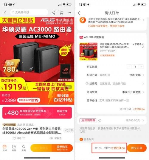 特意在天猫测试了一下,华硕灵耀AC3000 Mesh路由,累计可减免780元, 1919元就可以入手,可以说是上市以来的最低价。