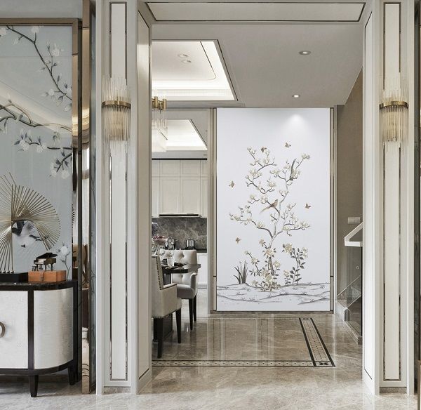 《听香》温馨而细腻,或热烈而含蓄。应用于墙面装饰,既有好看的样式却又不拘于形式,自然秀丽,清雅脱俗,富有诗情画意。在保存玉兰花原有自然形态之下,灵鸟翩跹,华枝春满,达到“虽由人作,宛自天开”的境界,正所谓“外师造化,中得心源”。