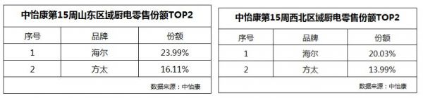 具体来看,在以青岛、济南、济宁等地为主的山东区域,占据TOP2的分别是主推“健康厨房场景”的海尔和主打“全场景健康厨房”的方太,零售量份额分别为23.99%、16.11%。另外,在以兰州、西安为主的西北区域,当周TOP2也分别是海尔和方太,其中海尔厨电零售量份额为20.03%,方太零售量份额为13.99%。