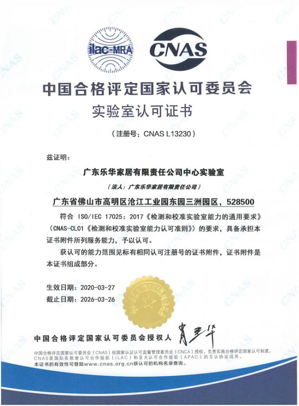 箭牌家居集团股份有限公司旗下的广东乐华家居有限责任公司中心实验室(下文称中心实验室)于2019年12月通过国家CNAS专家组的现场评审,并于2020年3月27日正式获取资质认可证书。