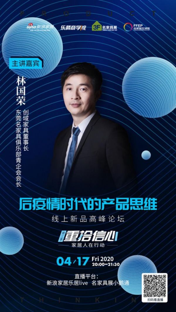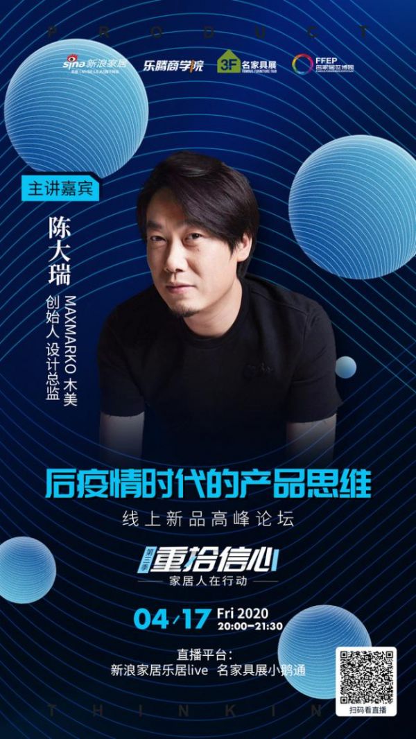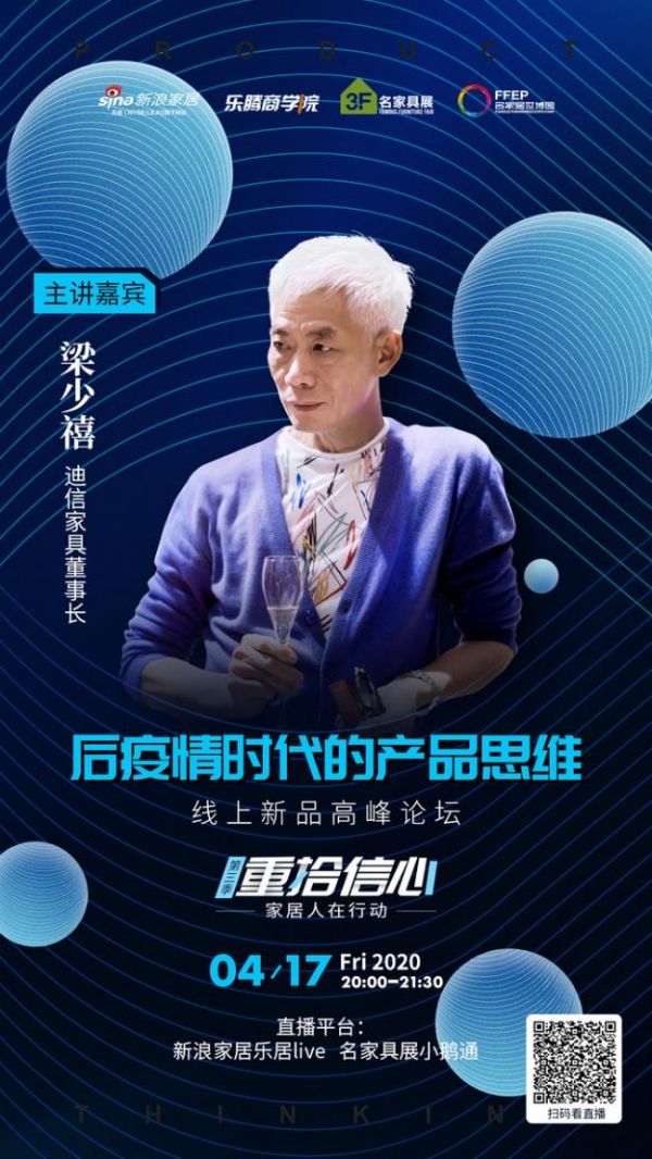 2020年4月17日,由新浪家居、乐腾商学院、名家具展及名家居世博园联合举办的线上新品高峰论坛——“重拾信心——家居人在行动”系列线上论坛第三季之后疫情时代的产品思维论坛正式开启。