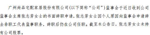 据了解,张志芳因个人原因向监事会申请辞去非职工代表监事职务,辞职后仍在公司任职。尚品宅配2019年披露财报显示,张志芳税前薪酬为115.2万元,未持有公司股份。