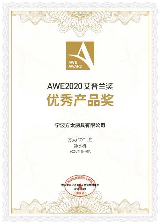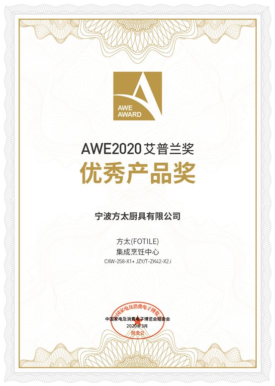 4月16日,AWE2020艾普兰奖首次通过云在线正式发布。方太净水机YCZ-JT120-M5A、方太集成烹饪中心CXW-258-X1+ JZY/T-ZK42-X2.i、方太两箱全蒸烤烹饪机ZK31-Z3M7.i等三大创新性产品从517件产品中脱颖而出,斩获本年度的艾普兰优秀产品奖。这也是方太连续七年获得AWE艾普兰奖。