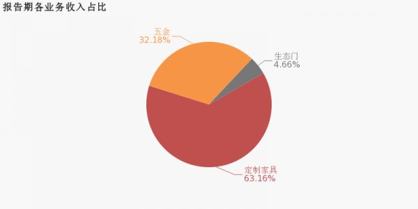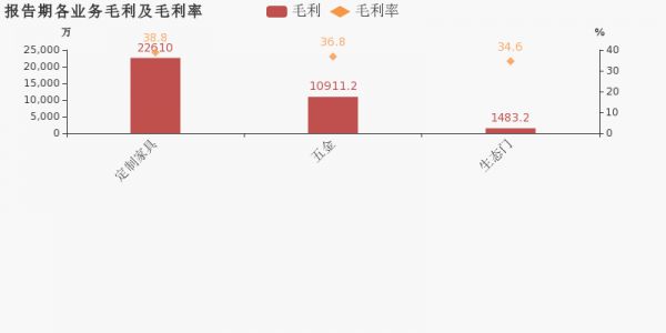 从业务结构来看,“定制家具”是企业营业收入的主要来源。具体而言,“定制家具”营业收入为5.8亿,营收占比为63.2%,毛利率为38.8%。