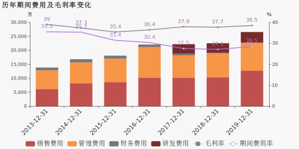 公司2019年营业成本5.7亿,同比增长10.5%,低于营业收入11.9%的增速,导致毛利率上升0.8%。期间费用率为28.5%,较上年升高1.4%。经营性现金流大幅上升116.5%至6275.2万。公司本期研发投入为3755万,同比上升11.2%。研发投入全部费用化,不作资本化处理。