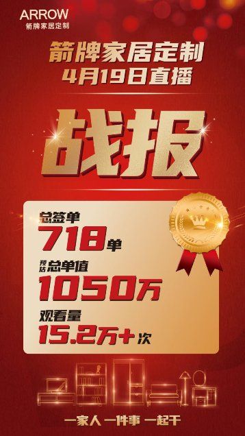 福利满满、优惠多多的箭牌家居定制直播活动,在经过半个多月的精心策划和准备后,在4月19日晚正式圆满地落下帷幕。这场长达3小时的直播狂欢盛宴,共吸引了超过15万人的在线观看,当场成交的订单数多达718单,预估成交金额更是高达1050+万!本次箭牌家居定制4.19直播交出的这份优异成绩单,不仅充分说明了箭牌家居定制一直深得大家的信赖,更证明品牌自身的雄厚实力!