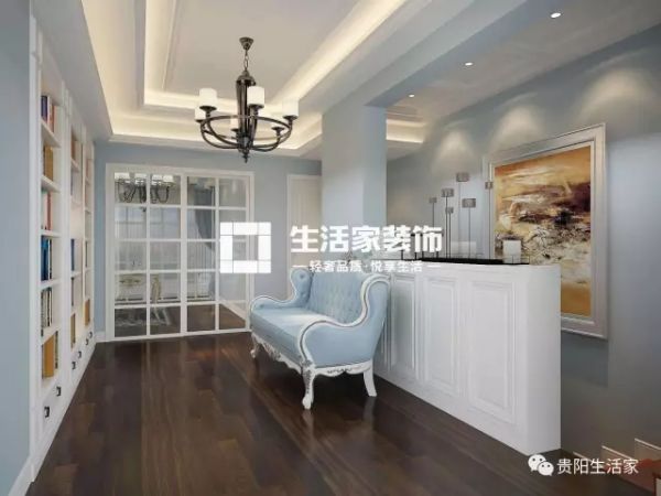 ▲过道采用了简欧风格的经典颜色,白色的柜台,选择油画作为墙面装饰,浅蓝色的隔断墙,上面利用镂空点缀,路过时带给人一种温馨气息。