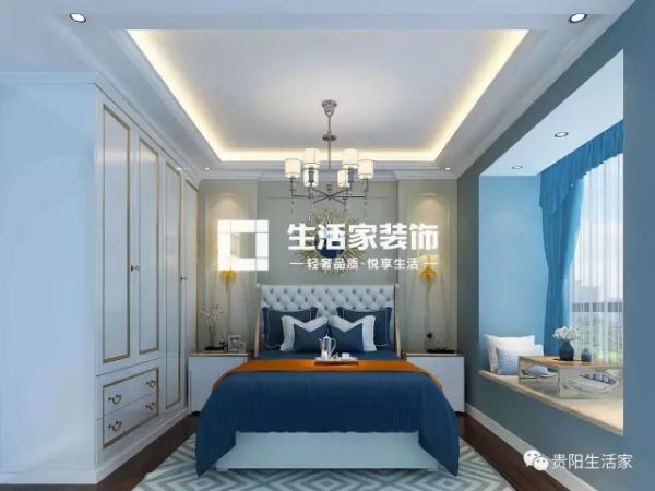 ▲次卧室空间不大,颜色搭配采用和主卧室一样的色调,光线明亮,蓝灰色的背景墙和纱质窗帘,清新淡雅,舒适惬意。