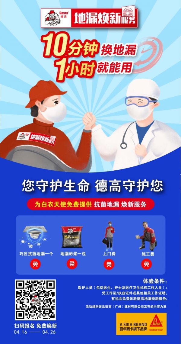 活动期间,医护人员(包括医生、护士及医护卫生机构工作人员)凭相关工作证明(单位工作证、执业证件等)有机会免费体验德高抗菌地漏焕新服务。名额有限,抓紧时间!
