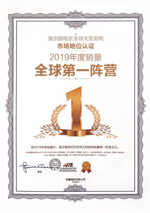 4月22日,世界权威市场调查机构欧睿国际从英国发来一份市场地位认证书。证书显示,在全球大型厨电市场,海尔厨电2019年度销量居全球第一阵营。同时,调研结果也显示,“海尔系”厨电2019年全球销量达到约1222万台,占全球大型厨电市场总销量的7.7%,这也是中国厨电首次迈过“千万台”门槛。