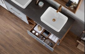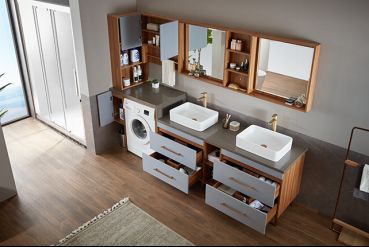 很多家庭早上总会上演抢夺战。与其争分夺秒,不如让自己享受早晨的从容自在。圣菲轻奢定制间,双台盆的设计,不再担心上演抢夺战。一人一边,各不干扰。不仅能“装”还特懂浪漫。