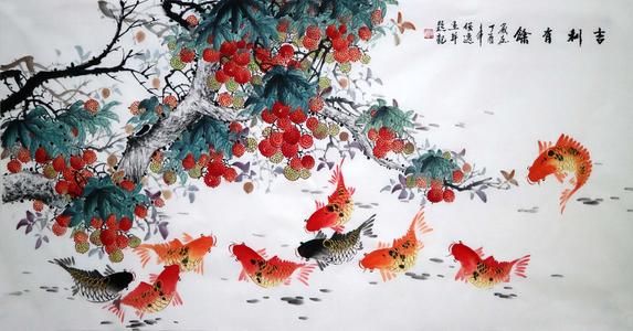 荔枝九鱼画是比较吉利的画,能给家庭成员带来好运。这种画形态优美,四季常绿,图中“鱼”的发音与“余”是同音,代表年年有余;而“鲤”的发音与“利”相同,所以鲤鱼也用来象征生意中收益和盈利。