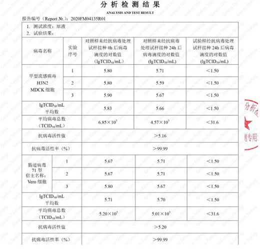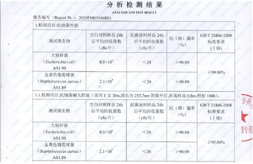经国内权威微生物检测机构分别对产品抗病毒性能和抗菌性能进行了严苛检测,其实验数据表明,臻天然抗病毒无机矿物涂料对甲型流感病毒(H3N2)、肠道病毒71型(引起手足口病的一种病毒)、大肠杆菌、金黄色葡萄球菌等病菌具有99.99%的超高灭活率,属于可检测的最高级别杀灭率,相较其它普通的装修涂料,该产品拥有更稳定更出色的抗病菌功效。