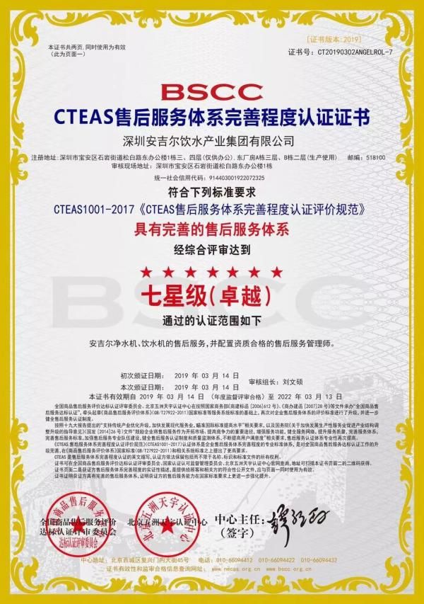 在服务上,安吉尔为用户提供解决方案免费设计四项健康服务、四重安全保障,七星级服务体系认证。