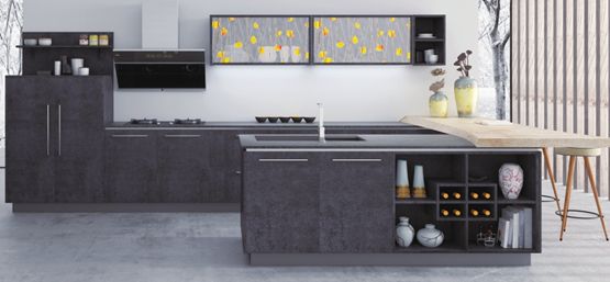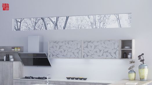 最让人耳目一新的是醉花间选用的琥珀面板,将银杏叶、迷你竹、玉兰叶嵌入其中制成半透明的吊柜,质感极强,它增强了醉花间产品整体的时尚感、艺术感,更是打造出四月人间芳菲春光正盛,花醉人间的自然意味。在现代风格风靡的今天,大同小异的产品设计让很多人都产生了审美疲劳,市场上逛下来,颇有乱花渐欲迷人眼之感。柏厨以敏锐的市场嗅觉早早的发现了机遇,通过不断的实践才走出了原创的“新中式”家居审美之路,将文化古意写进产品设计之中,为产品赋予了更高的价值感。