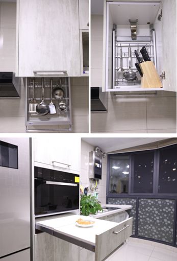 还有采用人机工程学半高柜内嵌拉篮,充分扩展地柜的存储空间,打开柜门后层板中会有晶莹的层板灯自动亮起,使用方便快捷,灶台边的半高柜顶部设计成了开放存储区,烹饪时常用的工具和调料被安置在这里,可以不必费力从柜子中拿出。