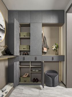 在三重境遇玄关里,有可以装下整个四季的高低鞋柜,有可以装满随身小物的双拉手长抽屉里,还有靠岸和启航的换鞋凳,服务于户主的晨出夕归。客厅巧妙的设计,高柜可安放易碎古玩,地柜摆放装饰小物件,而生活零碎小物藏于落地抽屉,一切静好。