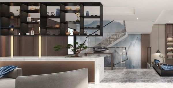 展示柜下方摆放了一盆松树盆栽,既为空间增添了一抹绿色的生机,又凸显出中式的文人气节,同时与展示架上的艺术品搭配,显得错落有致,具有艺术的美感。在古朴典雅之中,系上缕缕新中式的东方印记。