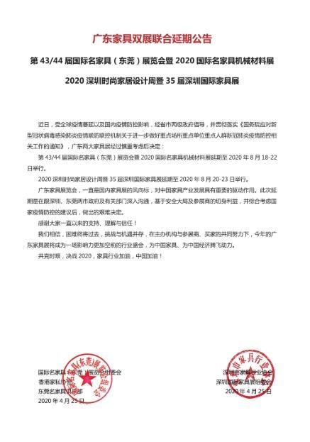 公告称,受全球疫情蔓延以及国内疫情防控影响,经省市两级政府倡导,并贯彻落实《国务院应对新型冠状病毒感染肺炎疫情联防联控机制关于进一步做好重点场所重点单位重点人群新冠肺炎疫情防控相关工作的通知》,广东两大家具展经过慎重考虑后决定:第43/44届国际名家具(东莞)展览会暨2020国际名家具机械材料展延期至2020年8月18至22日举行。