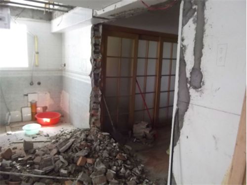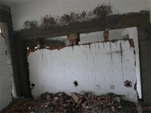2、在敲墙的过程当中,如果不计损失的话,我们就可以选择使用大锤把墙体以1到1.5米间距离,各砸出一道豁口,在豁口深度可往墙底。然后再砸成功豁口以后留下的墙上,绑上一根牢固的绳子,几个人一起拉动墙体,一面墙体就很快倒下,若考虑成本的话,不想损失太大,那就只能先清除墙皮,然后再一层一层揭下来,但这种方式比较慢。