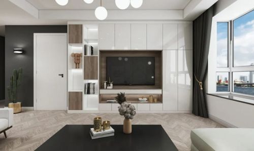 其次,电视墙采用推拉门柜+开放收纳格的设计,可以通过满墙的柜子实现收纳的最大化,解决客厅大部分的收纳需求,而利用Slido Flat 20 IF五金让客厅看起来清爽干净更富有线条美感。
