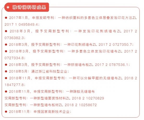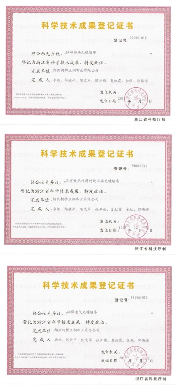 2020年邹董与优秀的专业团队再创新篇,获得“环保透气无缝墙布”、“防污防油无缝墙布”、“具有散热作用的纯亚麻无缝墙布”三大科学技术成果,为雅诗澜产品质量奠定坚实的基础与保障。
