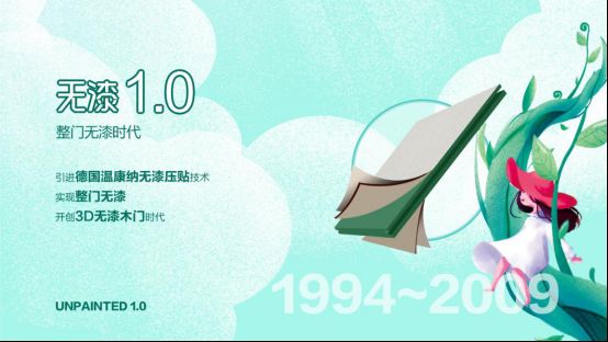 至2019年,已经完成了“第四代无漆技术”的升级。时值首届中国木门无漆日,更将发布划时代的创新技术——第五代无漆技术,它将是中国木门行业环保创新升级的又一重大里程碑。