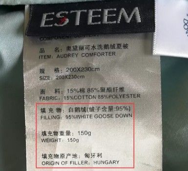 ESTEEM的鹅绒夏被标签上堂堂正正的写着 - 95%匈牙利白鹅绒。